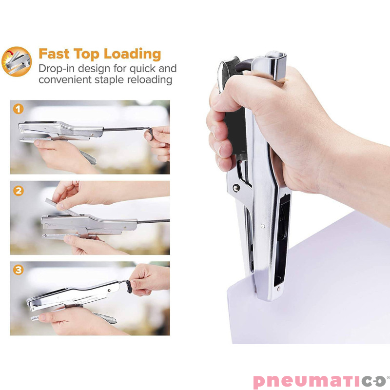 Lekki zszywacz biurowy dociskowy z wygodnym, ładowanym od góry magazynkiem na serie łączników SP1906Z o długości 6mm. Ze względu na mniejszą siłę potrzebną do zszywania jest zalecany wszędzie tam, gdzie niezbędne jest wykonywanie wielu zszyć dziennie. Zszywacz jest często używany w recepcjach hotelowych oraz w zszywaniu etykiet towarowych do produktów.