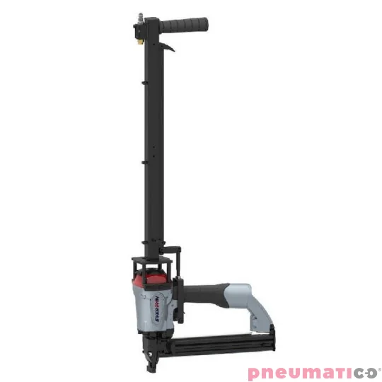 Zszywacz przemysłowy Everwin SN40, przeznaczony do przybijania tektury do palet drewnianych, jest uznawany za wzorzec wśród urządzeń na zszywkę o szerokości 25mm. Wykonany z wytrzymałych stopów magnezu, model SN40S2 łączy moc, trwałość i ergonomię, co czyni go wyjątkowym w swojej kategorii. Aby ułatwić pracę w trudno dostępnych miejscach, wykorzystuje się przedłużkę (pogostick / walking stick) do zszywacza pneumatycznego. Uchwyt Pneumatico P5040 pozwala na montaż tacek tekturowych do palet, nawet z zewnątrz, gdzie standardowe zszywacze nie są efektywne. Montaż przedłużki jest prosty i dostępny dla użytkowników na każdym poziomie zaawansowania. Urządzenie aktywuje się przez naciśnięcie spustu w górnej części uchwytu.