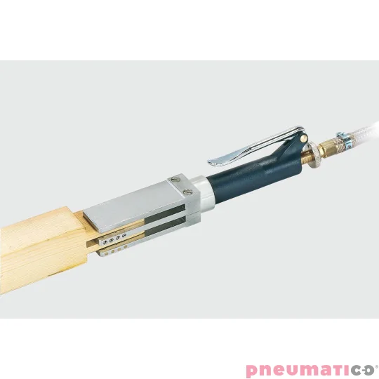 Dysza trójłopatkowa marki Pizzi - to mocowanie znacznie przyspiesza proces klejenia pojedynczych czopów. Dysza nakłada cienką, równomierną warstwę kleju na cztery strony jednocześnie - w porównaniu do ręcznej pracy z butelkami z klejem, praca jest wykonywana znacznie szybciej i przy znacznie mniejszej ilości odpadów. Ta dysza posiada cztery powierzchnie klejące typu szpachla, które rozprowadzają klej zarówno na górze, jak i na dole.