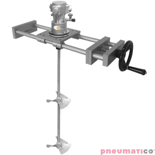 Zestaw, składający się z napędu pneumatycznego mieszadła, końcówki mieszającej z dwoma wirnikami oraz z mocowania na pojemniki z regulacją w zakresie 550-610 mm. Obroty prawe lub lewe.