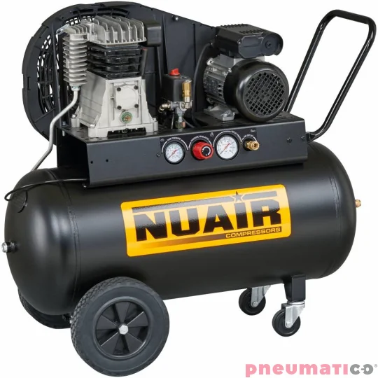 Profesjonalny kompresor NUAIR o wysokiej niezawodności i wydajności. Pompa z napędem pasowym - B3800B, który jest zamocowany na zbiorniku o pojemności 100 litrów. Powiększone tylne koła. przednie - obrotowe. Duży profilowany uchwyt transportowy. Zintegrowany panel kontrolny. Możliwe jest stosowanie dużej ilości narzędzi pneumatycznych i akcesoriów.