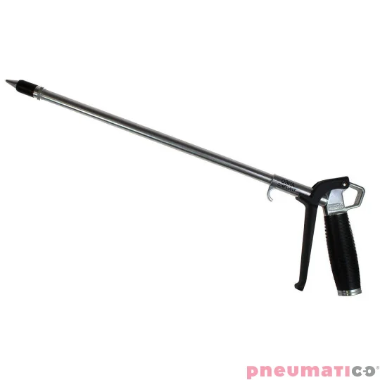 Pistolet do przedmuchu o dużym przepływie powietrza. Pistolet TYPHOON nadaje się do intensywnego użytkowania w przemyśle. Rękojeść wykonano z miękkiego, wygodnego tworzywa. W uchwycie znajduje się specjalny spust umożliwiający regulację i kontrolę przepływu powietrza. Zwężająca się końcówka pistoletu pozwala na dotarcie do trudno dostępnych miejsc. Końcówka Typhoon wykorzystuje zjawisko fizyczne znaną jako "Efekt Coandy" generując przepływ powietrza, które ma tendencję do przylegania do najbliższej powierzchni. Powoduje to ukierunkowanie strumienia powietrza bezpośrednio na przedmuchiwaną powierzchnię, w efekcie końcowym oddziałując z 20-30% zwiększoną siłą oddziaływania w porównaniu do pozostałych pistoletów.