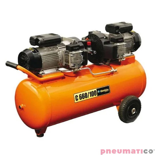 Bezolejowy kompresor z dwu cylindryczną pompą, montowany na 100 litrowym zbiorniku. Przeznaczony dla użytkowników wymagających znacznej wydajności powietrza (660 l/min), oraz dużej stabilności wypływu powietrza (zbiornik 100 l).