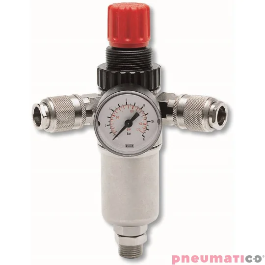 Reduktor pionowy ciśnienia służy do regulacji ciśnienia wyjściowego z kompresora tłokowego. Reduktor model RPF187 posiada dwa szybkozłącza żeńskie normalnie zamknięte. Najczęściej jest montowany na zbiornik ciśnieniowy o pojemność od 50 do 200 litrów.