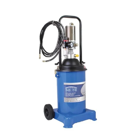 Wysokociśnieniowa smarownica pneumatyczna do pompowania smarów. Zbiornik z pracującym wewnątrz dociskiem smarowym.