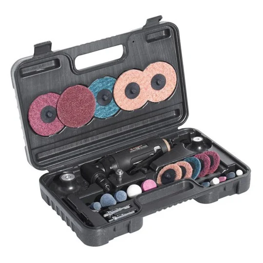 Zestaw zawierający 27 akcesoriów, niezbędnych w warsztacie każdego majsterkowicza. Szlifierka trzpieniowo-katowa z chwytem 6 i 3 mm pozwala na pracę różnorodnymi akcesoriami (frazami, kamieniami korundowymi, tarczami listkowymi).