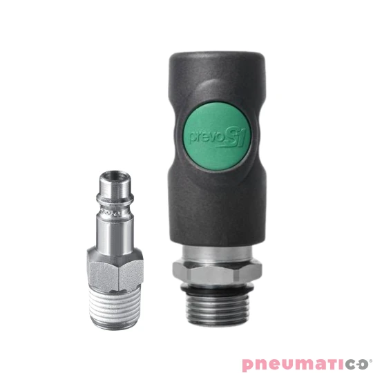 Połączenie w szybkozłączce bezpiecznej Prevo S1 gwint 1/2" Z ESI 071153 możesz zrobić w taki sam sposób jak w innych szybkozłączkach, poprzez wciśnięcie wtyczki do gniazda. Trzask oznacza, że wtyczka została pewnie umieściłeś wtyk w złączu. Aby rozłączyć naciśnij zielony przycisk. Powoduje to zamknięcie zaworu i odprężenie systemu od strony wtyczki. Szybkozłączka bezpieczna PrevoS1 z systemem rozłączania bezciśnieniowego została zaprojektowana po to, aby umożliwić ujście zgromadzonego powietrza z przewodu. Szybkozłączka bezpieczna PrevoS1 jest częścią zestawu: szybkozłączka-pistolet do przedmuchu-osłona przewodu. Zestaw ten gwarantuje wysoki poziom komfortu użytkowania i bezpieczeństwo elementów otoczenia, gdyż nie rysuje powierzchni i nie zaczepia się o elementy otoczenia.