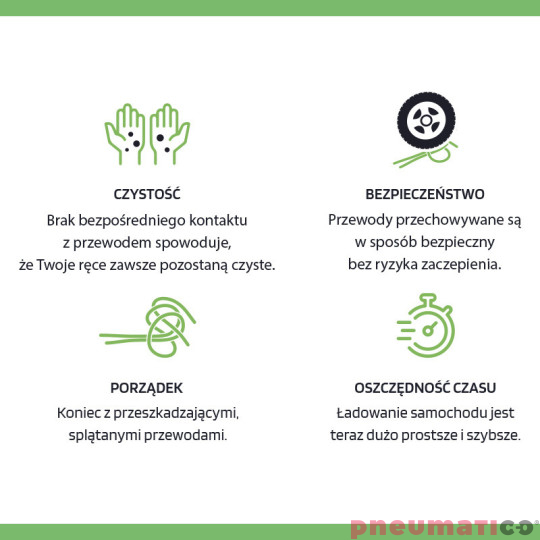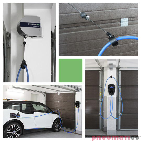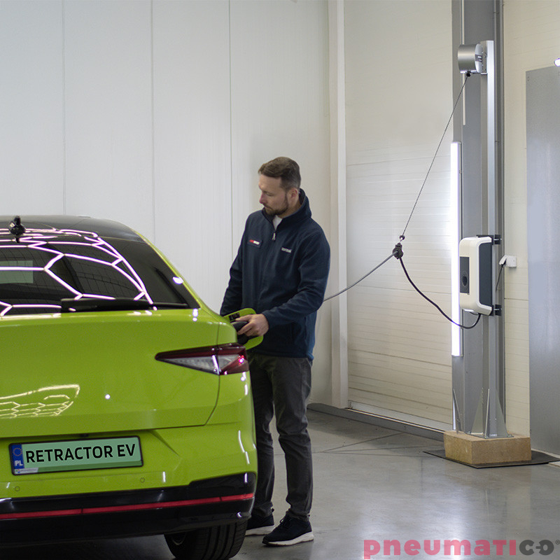 Retractor EV marki Pneumatico to innowacyjny uchwyt z funkcją automatycznego podtrzymywania kabla, który rewolucjonizuje proces ładowania pojazdów elektrycznych. Używając tego uchwytu zapomnisz o splątanych i brudnych kablach ładowarki. Retractor występuje w 4 modelach, różniących się udźwigiem: EV0, EV1, EV2, EV3.