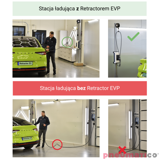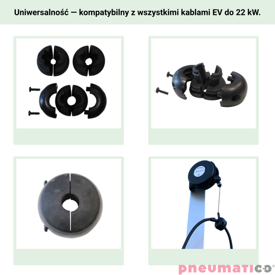 Uchwyt EVP marki Pneumatico to innowacyjny uchwyt z funkcją automatycznego podtrzymywania kabla, który rewolucjonizuje proces ładowania pojazdów elektrycznych. Używając tego uchwytu zapomnisz o splątanych i brudnych kablach ładowarki. Najprostsze rozwiązanie dla wszystkich kabli EV do 22 KW. Można zamontować na ścianie lub suficie i przymocować do kabla EV i... to wszystko! Działa ze wszystkimi markami wallboxów i z każdym rodzajem kabla, zarówno w nowej, jak i istniejącej instalacji! Nadaje się do użytku na zewnątrz i w trudnych warunkach pogodowych. Wyposażony w wytrzymałą, tekstylną linkę z włókna polietylenowego HT. Uchwyt ma dwa tryby pracy: ciągły i zapadkowy.