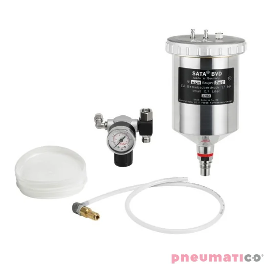 Zestaw montażowy marki SATA, przeznaczony do obróbki materiałów o wysokiej lepkości. Zestaw składa się z wysokiej jakości kubka ciśnieniowego o pojemności 0,75 l, mikrometra powietrzny / manometra i węża doprowadzającego. Idealny do nisko-mglistych, wtryskowo-technicznych przeróbek materiałów o wysokiej lepkości. Indywidualne dopasowanie ciśnienia materiału.